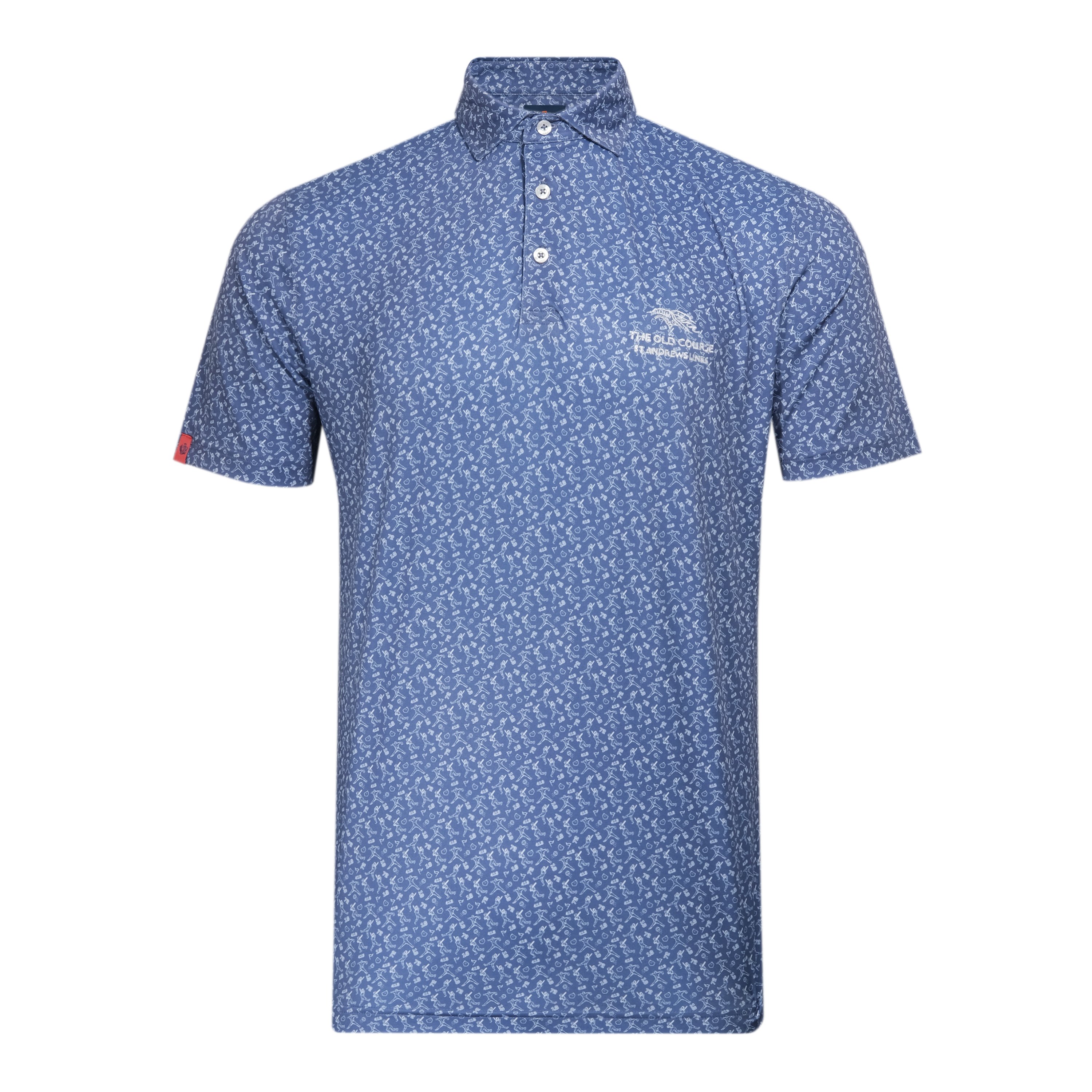 Donald Ross Gavin Polo in periwinkle blue features an all over baseball print on a premium jersey fabric. The Old Course St Andrews Links logo is embroidered in light blue on the left chest. The gaps in the lettering are representative of the three bridges that pass over the Swilcan Burn on the Old Course.