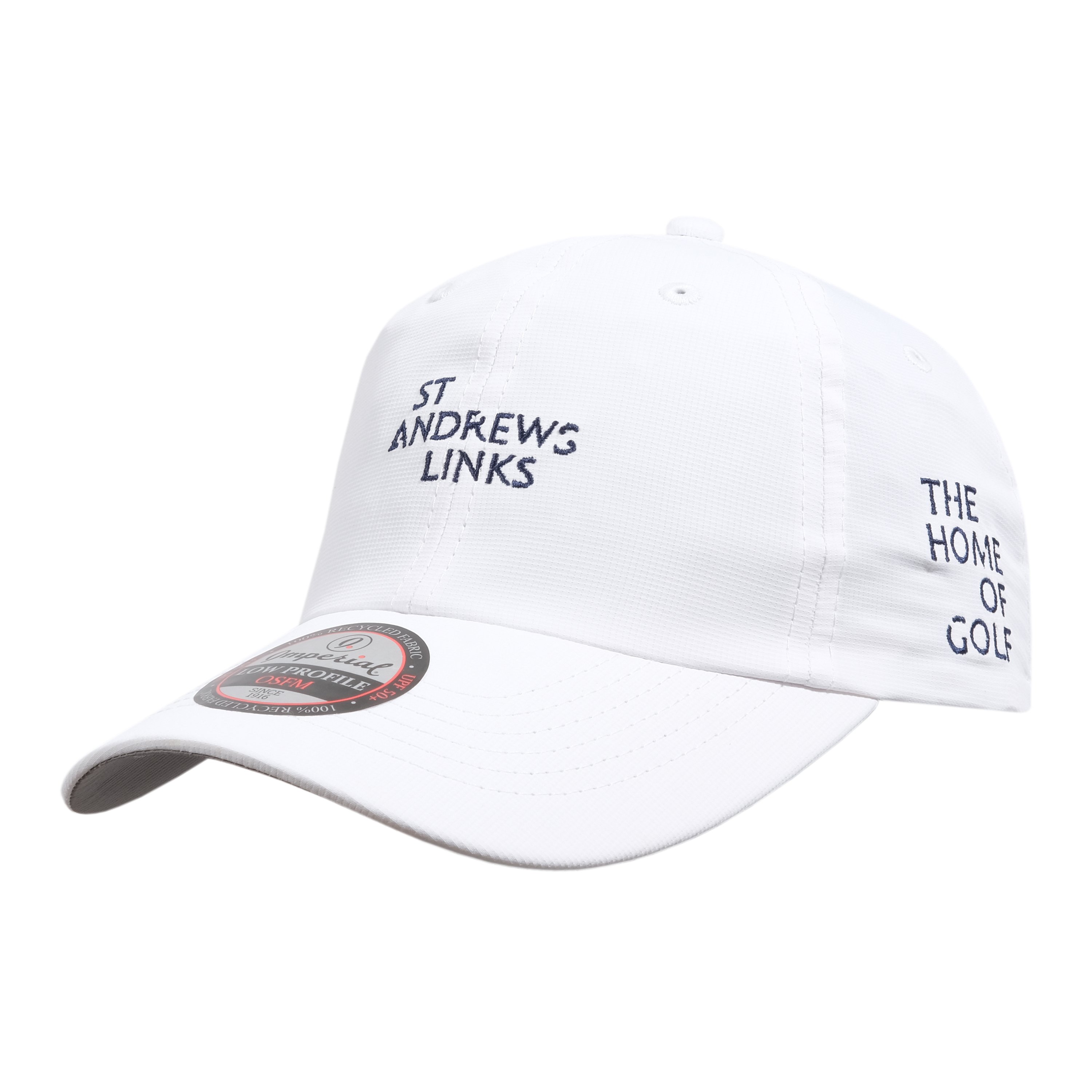 St Andrews Links Baseball Cap in navy features St Andrews Links embroidered in white on the front and The Home of Golf at the side. The gaps in the lettering are representative of the three bridges that pass over the Swilcan Burn on the Old Course.